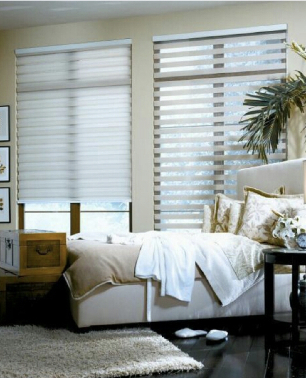 Zebra blinds are one of the most popular window coverings for modern condos. They feature alternating sheer and solid fabric bands, creating a layered appearance.